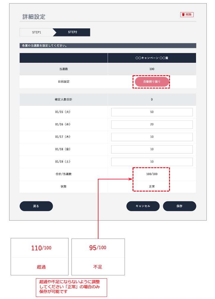 3.「自動割り振り」をクリックして、均等に配分し、各日毎の当選数を調整してください。